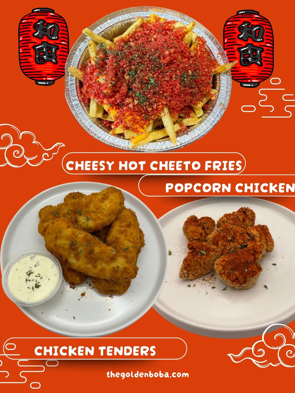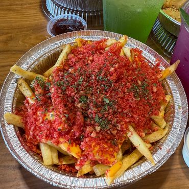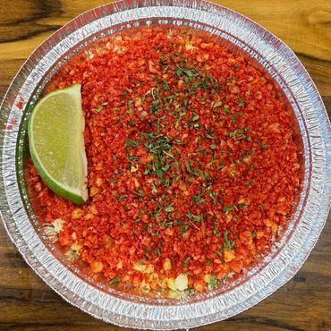 Corn with mayonnaise, cojita cheese, paprika, and tapatio and topped with Flaming Hot Cheetos