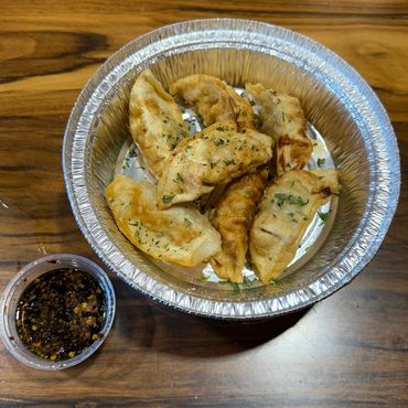 Fried pork and vegetables dumplings (5 pieces) with house spicy sauce
