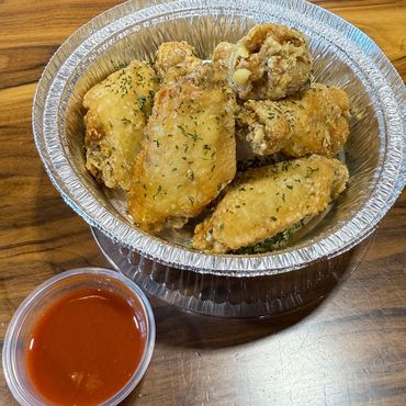 with sauce of your choice: Buffalo / Honey BBQ / Lemon Salt Pepper Rub /